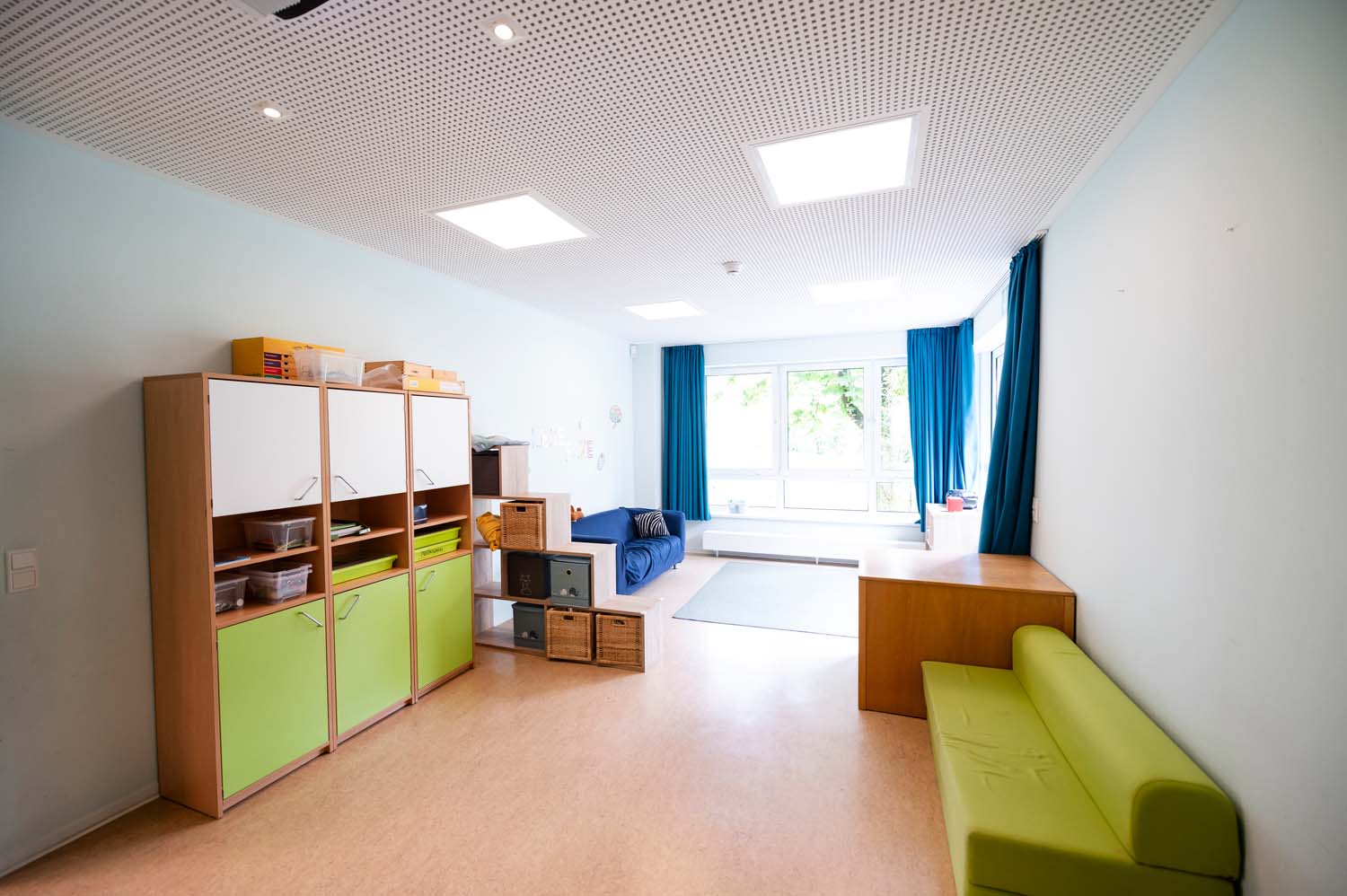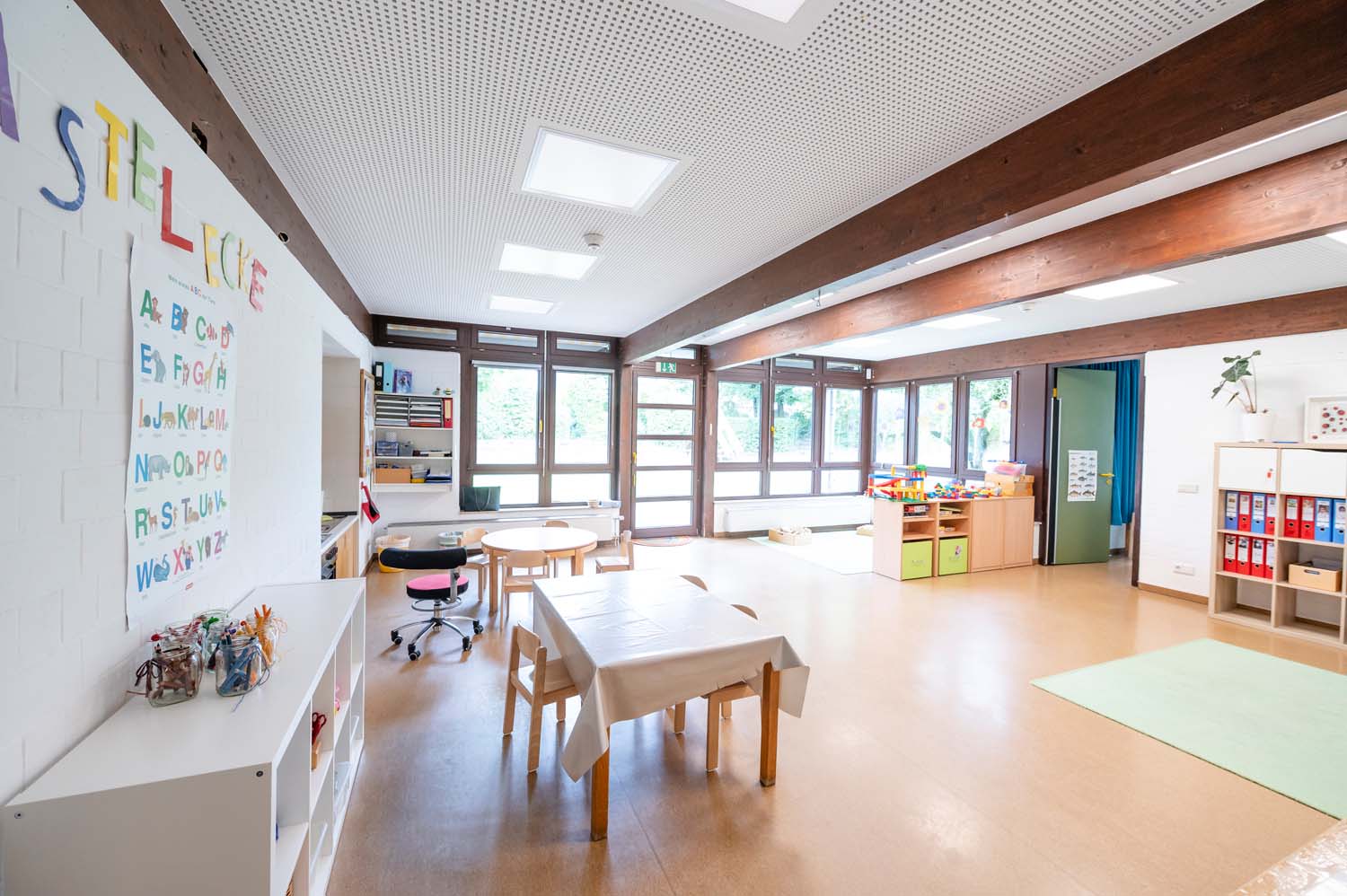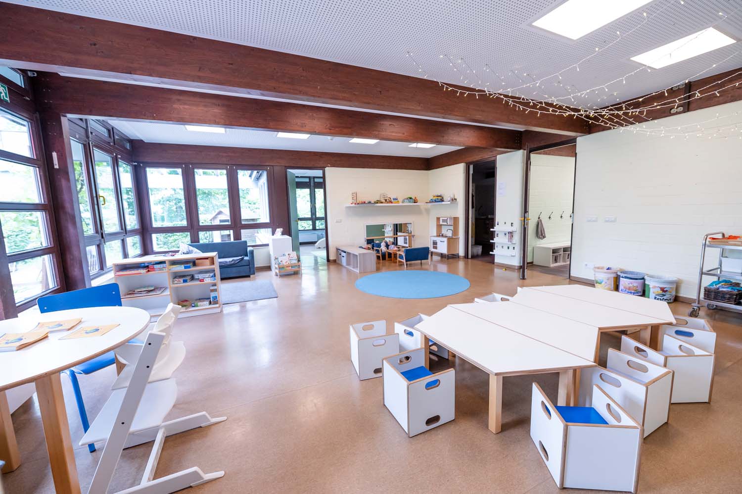 Die Raumkonzepte orientieren sich nicht nur an den verschiedenen Altersgruppen der Kinder, sondern auch an denen des pädagogischen Personals. Es gibt Rückzugsmöglichkeiten für die älteren Kinder, aber auch viel Platz für Bewegungsfreiheit mit freier Sicht, damit die jüngeren Kinder ihre Bezugspersonen jederzeit sehen und sich sicher fühlen können.